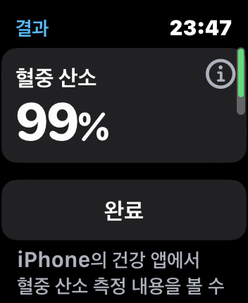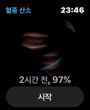 애플워치에서 앱을 실행 손목을 펴고 시작을 누르면 혈중 산소 측정을 시작하게 되며 결과가 나오기까지 15초 정도 진행 됩니다.