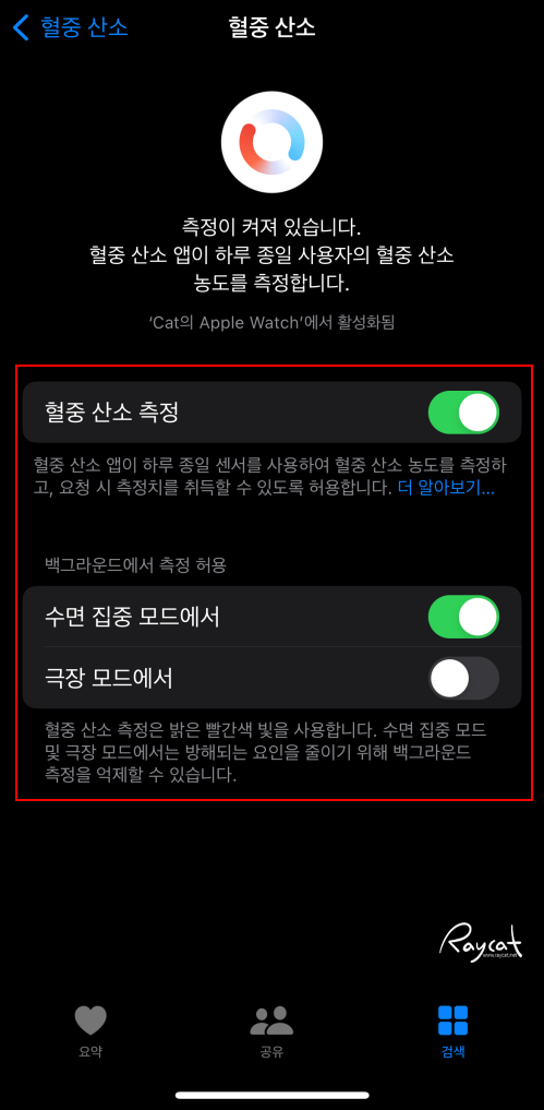 단 이 기능을 활성화하면 애플워치 배터리는 조금 더 빨리 소모하게 됩니다. 혈중 산소는 건강 중에 중요한 기능이라 제경우 그냥 활성화해두고 사용하고 있습니다.