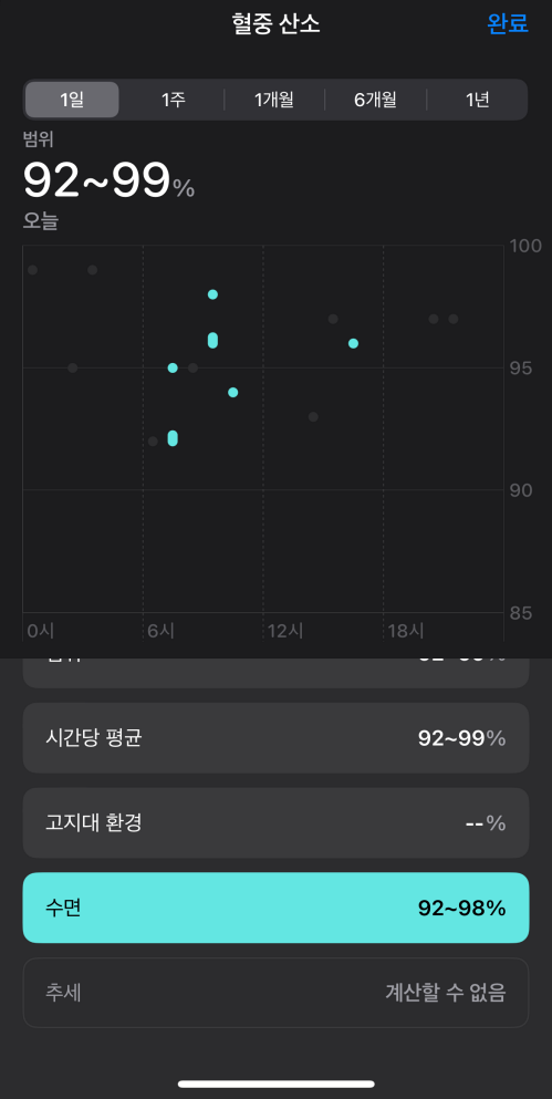 시간당 평균, 일일 평균, 수면중, 고지대 환경 등 혈중 산소포화도를 측정해 그 기록을 보여줍니다.