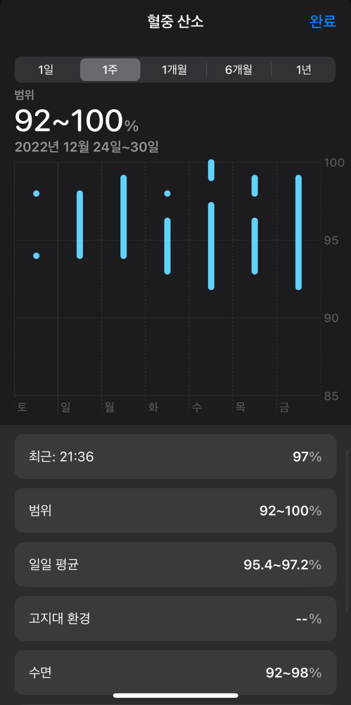 애플워치로 측정된 혈중 산소는 아이폰의 건강 앱에 데이터가 모두 누적되어 주, 월, 6개월, 년 단위로 통계로 볼 수 있습니다. 위 캡처 이미지처럼 각 항목을 선택하면 상단의 그래프가 변하며 항목별 데이터를 보여줍니다.