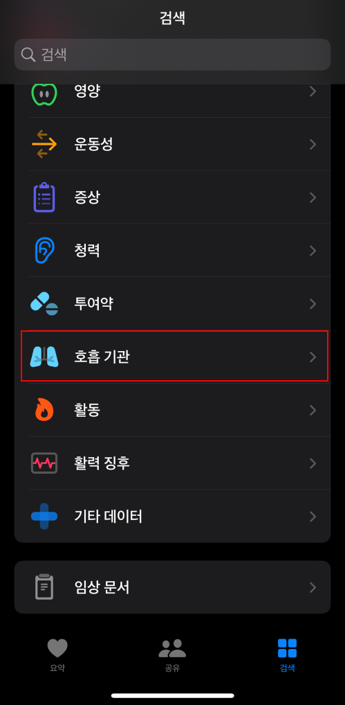 아이폰에서 건강 검색을 탭 하면 건강과 관련된 여러 항목이 나오는데 호흡 기관을 선택하면 혈중 산소 설정으로 넘어가게 됩니다.