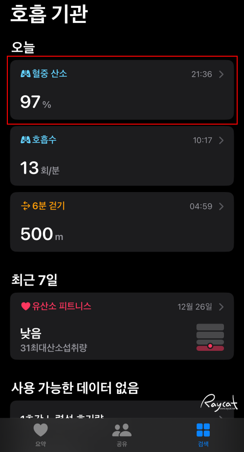 호흡 기관 항목을 보면 사람의 호흡과 관련된 애플워치 사용자의 혈중 산소, 호흡수, 걷기와 운동과 관련된 유산소 피트니스의 데이터도 함께 볼 수 있습니다.