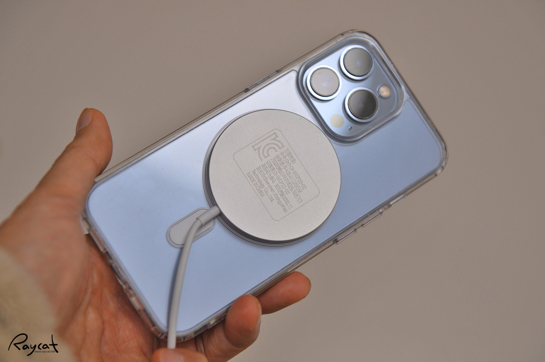 맥세이프 충전기를 케이스 뒤쪽 내장 자석선에 맞춰 붙이면 착하고 붙으며 충전이 시작됩니다.
