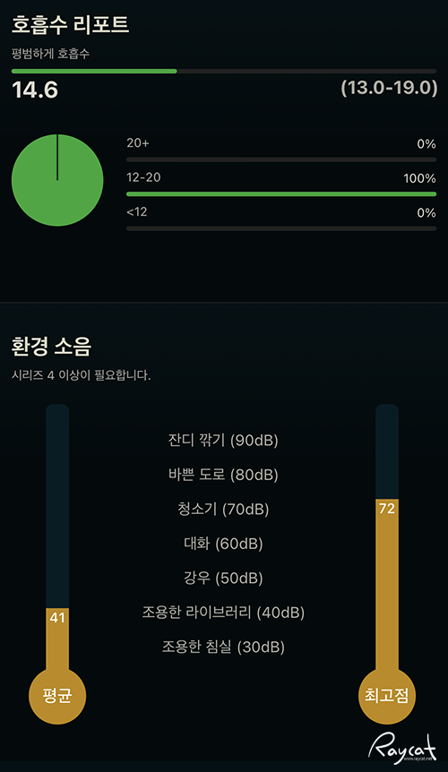 수면 중에 측정된 환경 소음은 다른 상황과 비교해 보여주는데 보통 제 경우 수면 중 환경소음을 보면 조용한 도서관 수준의 41dB로 측정되고 있습니다.