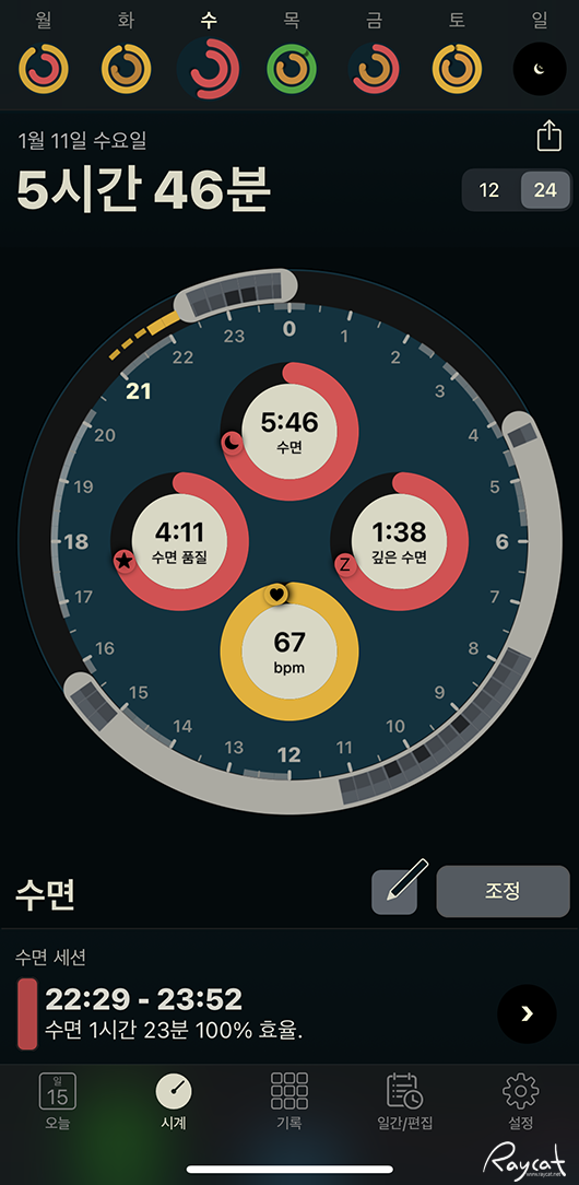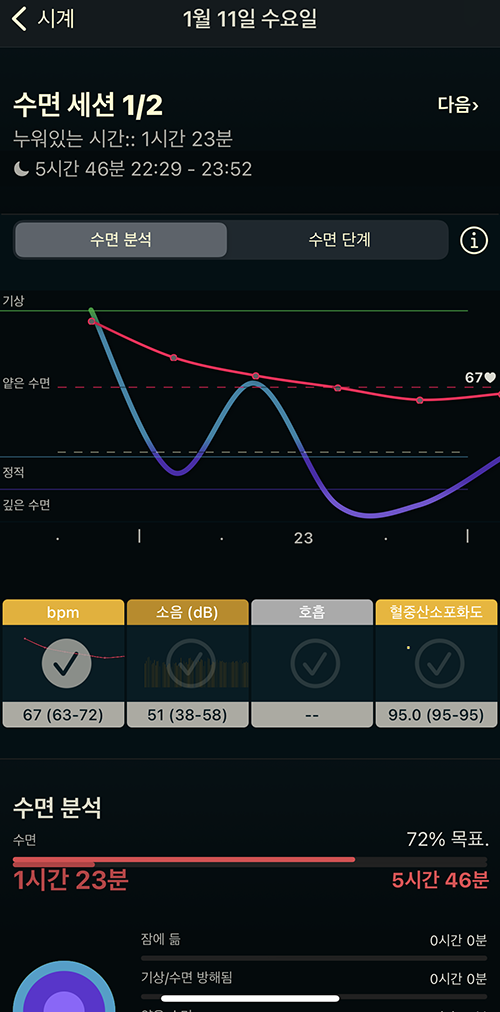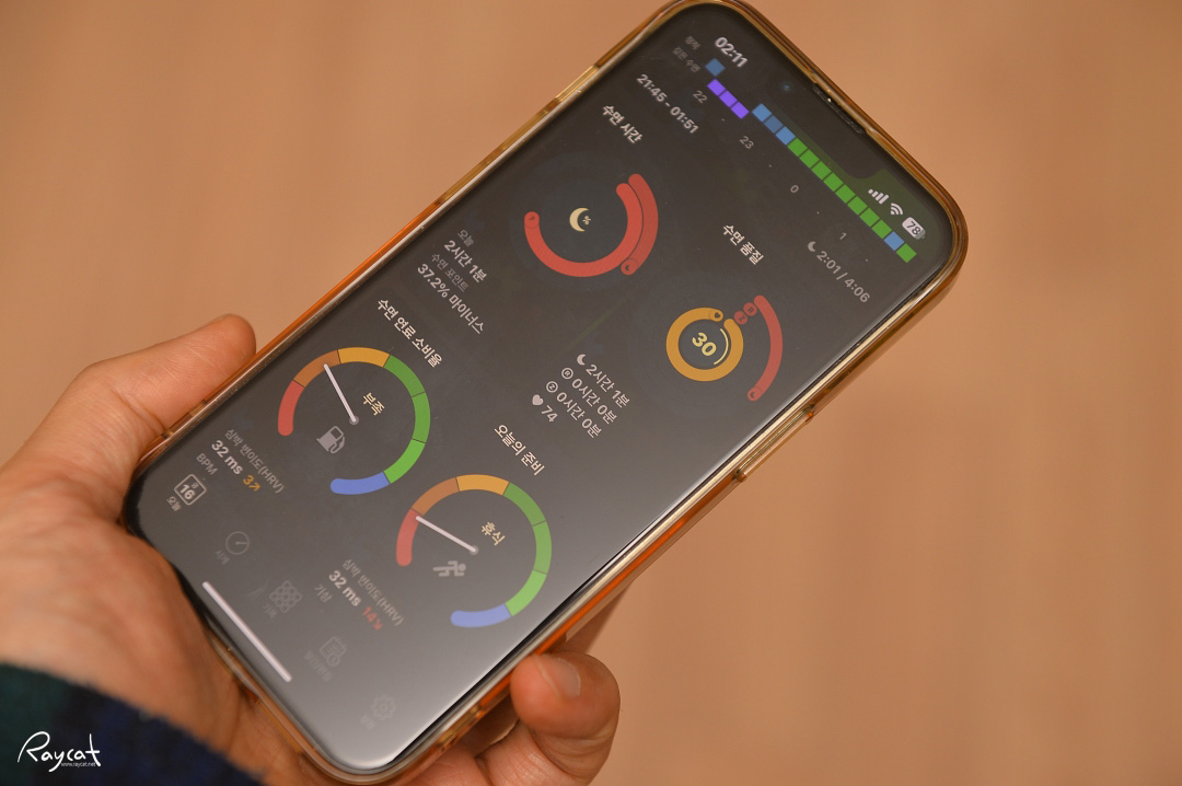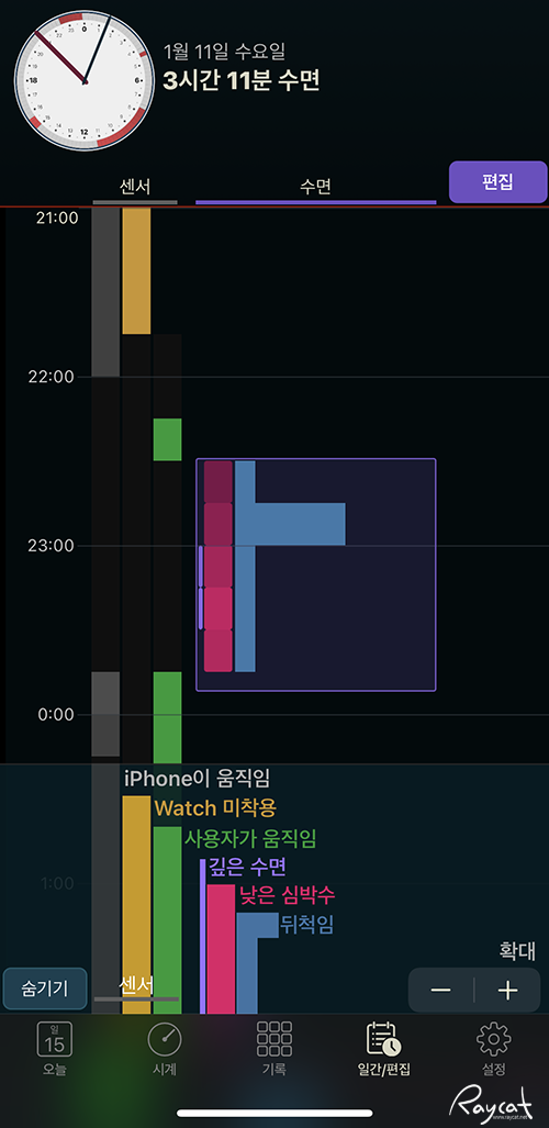 데이터도 상당히 정확하고 상황을 세세하게 시간별로 구분해 보여주기 때문에 기본 수면앱 보다 시각적으로 훨씬 보기 좋고 더 편하게 활용할 수 있습니다.