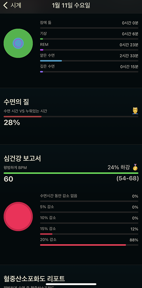 오토슬립으로 측정된 각 날짜의 데이터를 보면 제 경우 수면품질이 그렇게 좋은편은 아닙니다. 특히 새벽에 자주 잠들다 보니 너무 늦게 취침한 날은 심박수에 조금 문제가 있는 걸로 나오더군요. 잠이 보약이라고 하는데 잠을 잘자야 하는데 그래도 편안하게 잔 날과 그렇지 않은 날 데이터를 보면 새벽 늦게 자는 습관을 줄이는 게 좋은 것 같습니다.