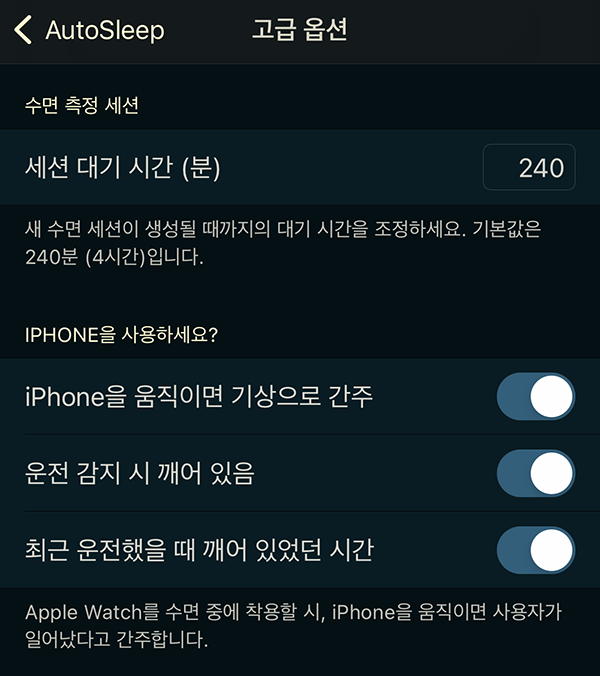 오토슬립 설정에서 아이폰을 움직이면 기상으로 간주를 켜두면 저처럼 자다가 깨면 아이폰을 먼저 켜보는 사람들의 경우 깨어남으로 기록하게 됩니다.