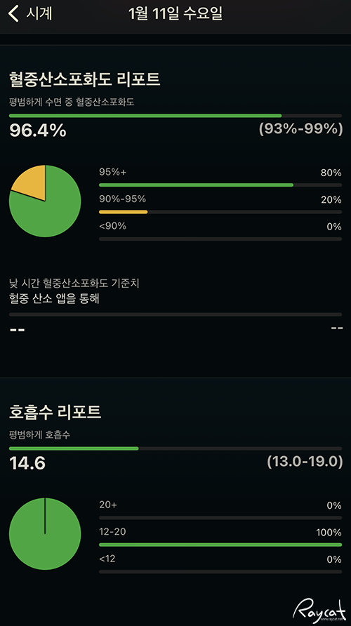 수면 중 혈중산소포화도는 90 이하로 내려가거나 호흡수의 경우 12 아래로 떨어지게 되면 건강에 문제가 있다고 볼 수 있습니다.