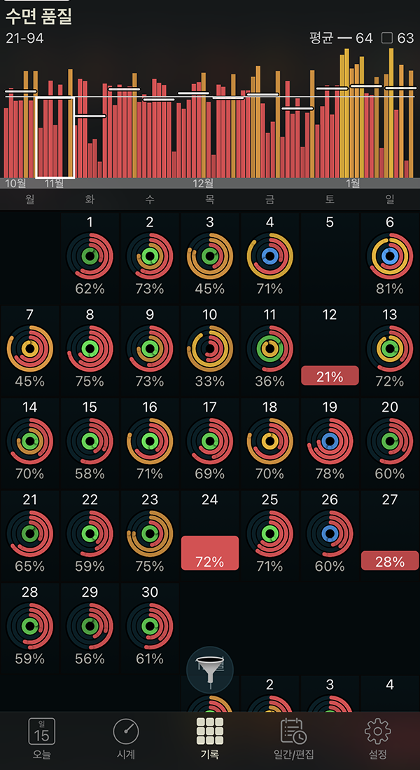 그리고 모든 날짜의 수면 데이터가 기록되기 때문에 어제와 오늘을 비교해 수면의 질이 어떻게 변했는지 모든 기간별 데이터를 확인해 보기 편합니다.