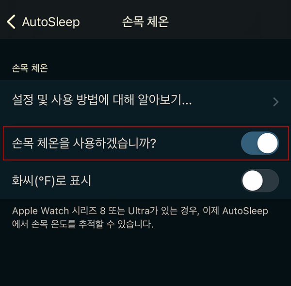 그리고 애플워치 시리즈 8이나 울트라를 사용하는 경우 설정에서 '손목 체온을 사용하겠습니까?'를 켜두면 수면중에 애플워치로 손목 체온을 측정해 데이터를 보여줍니다.
