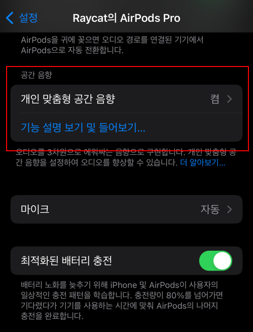 개인 맞춤형 공간 음향을 설정하기 위해 먼저 에어팟 프로를 아이폰 연결 후 에어팟 프로를 탭 합니다.