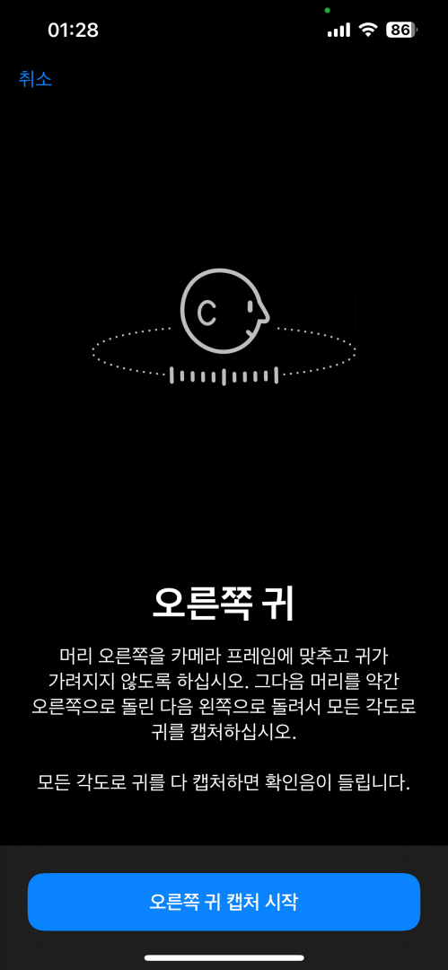공간 음향 개인 맞춤화에 트루뎁스 카메라를 활용하기 때문에 구형 아이폰의 경우 사용할 수 없는데 설정은 페이스 ID를 설정하는 것처럼 트루뎁스 카메라를 활용해 정면 얼굴을 먼저 스캔 후 양쪽 귀를 스캔하게 됩니다.