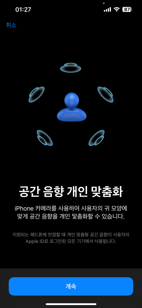 개인 맞춤형 공간 음향은 아이폰의 TrueDepth 카메라로 공간 음향 개인 프로필을 생성하여 사용자에게 꼭 맞는 청취 경험을 즐길 수 있도록 도와주고 있습니다. 설정하는 방법은 간단하지만 위 조건에 해당하는 기기만 설정이 가능하니 참고하세요.