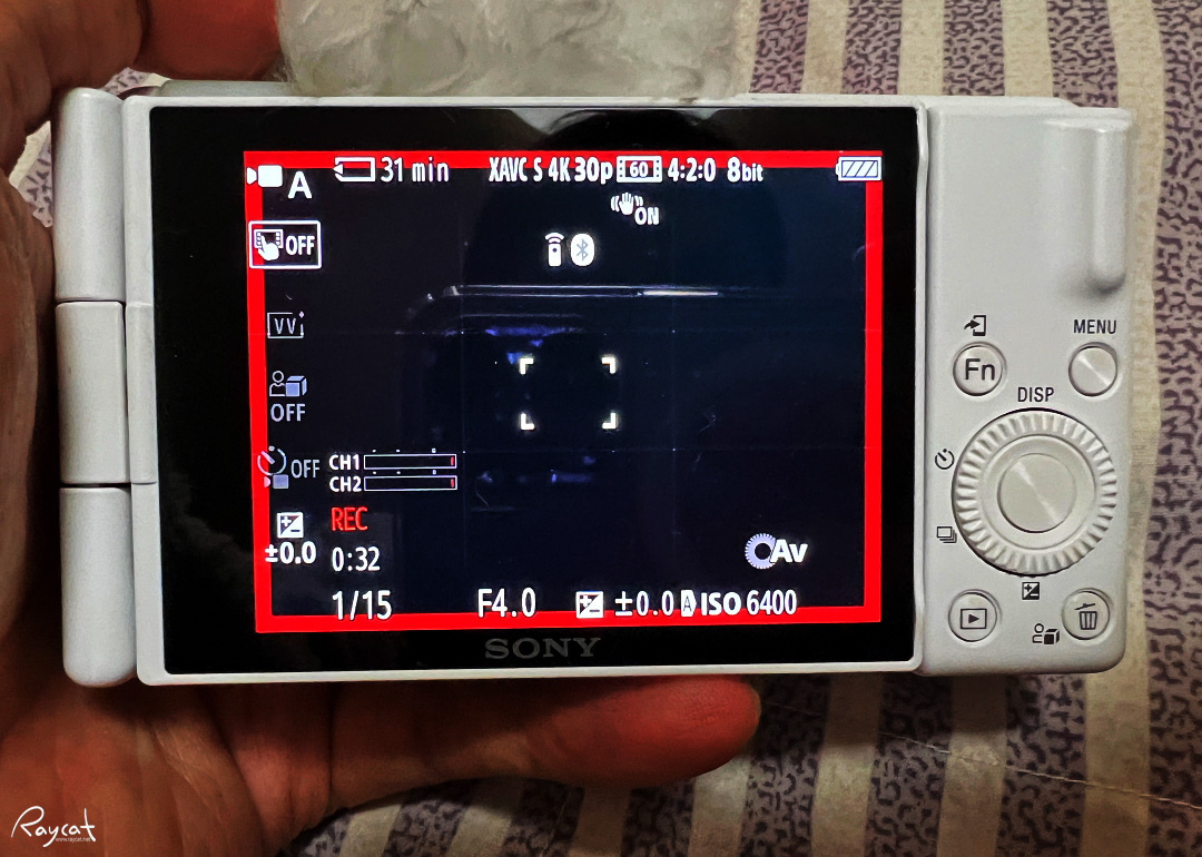 영상 촬영에 특화된 카메라여서 그런지 확실히 그런 기능들이 눈에 띄는데 그중에 하나가 영상 촬영 시 녹화 버튼을 누르면 버튼에 빨간불이 들어오며 화면에 위 사진처럼 붉은색 프레임이 표시되어 영상이 녹화되고 있음을 보여주며 깜박하고 녹화 버튼을 누르지 않았어도 알 수 있습니다.