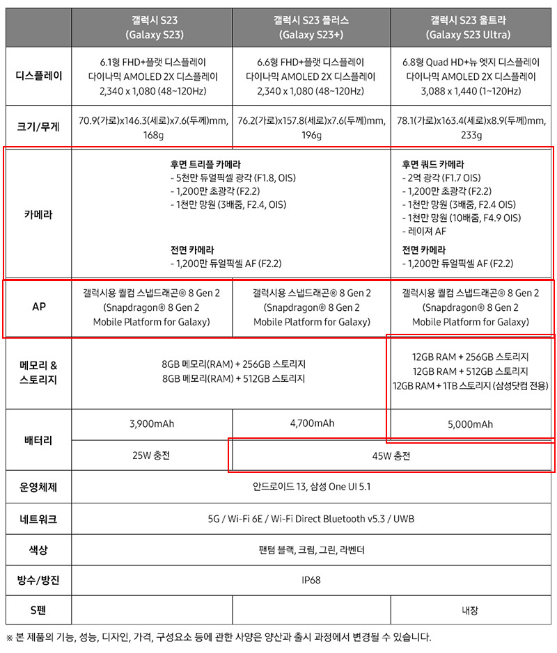 그리고 갤럭시 S23 울트라만 S펜을 지원하며 12GB 램을 지원합니다. 배터리 역시 갤럭시 S23 울트라가 가장 큰 5,000mAh의 대용량 배터리를 탑재하고 있습니다.