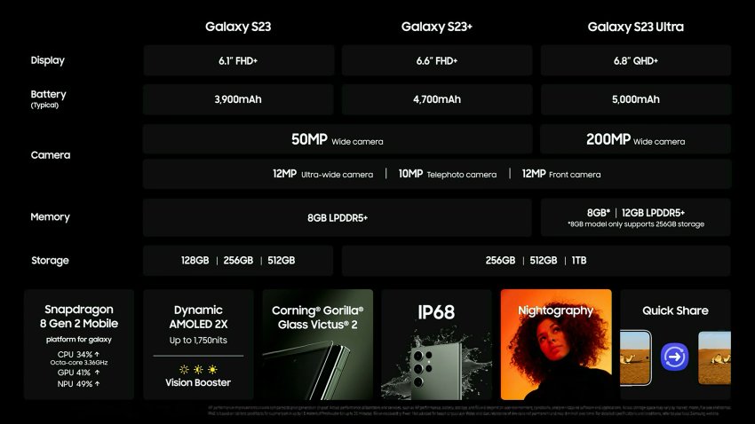 그리고 갤럭시 S23 울트라의 경우 1TB 저장공간을 지원하는 단말기는 삼성닷컴에서만 구매할 수 있습니다.