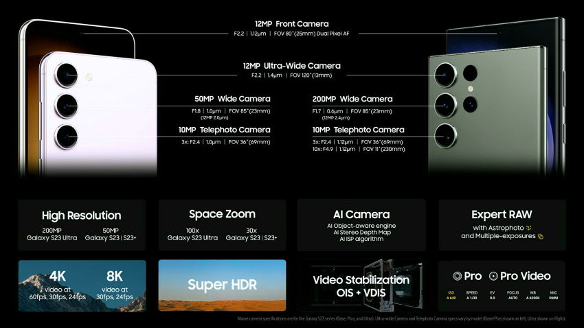 먼저 갤럭시 S23 울트라의 경우 2억 화소의 광각 카메라를 지원하며 S23과 S23+는 5천만 화소의 광각 카메라를 탑재하고 있습니다. 망원 10배 줌은 갤럭시 S23 울트라만 지원하고 있습니다.