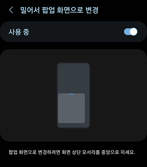 밀어서 팝업 화면으로 변경은 전체 화면에서 실행된 앱의 모서리를 잡고 밀면 팝업 화면으로 바뀌는데 한 번씩 꽤 유용하게 사용할 수 있습니다. 단 일부 앱은 예를 들어 게임이나 지도등 사용하는 앱 중에 일부는 모서리를 잡고 밀면 팝업창으로 바뀌다가 앱이 재실행되거나 종료되는 경우가 있습니다.