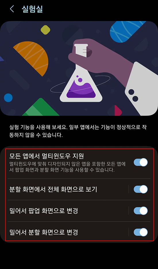 정식버전으로 업데이트하며 아마 다음 버전에서 정식으로 지원해주지 않을까 생각되는데 일부 기기는 이 화면분할을 지원하지 않습니다. 사용 설정은 간단한데 갤럭시 설정 - 유용한 기능 - 실험실을 선택하면 바로 볼 수 있습니다.