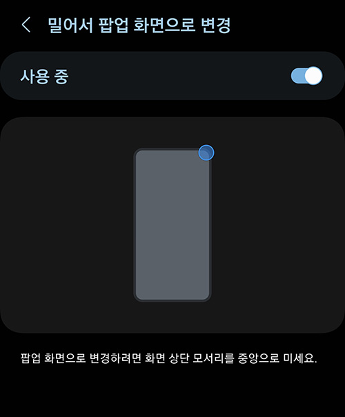 밀어서 팝업 화면으로 변경은 전체 화면에서 실행된 앱의 모서리를 잡고 밀면 팝업 화면으로 바뀌는데 한 번씩 꽤 유용하게 사용할 수 있습니다. 단 일부 앱은 예를 들어 게임이나 지도등 사용하는 앱 중에 일부는 모서리를 잡고 밀면 팝업창으로 바뀌다가 앱이 재실행되거나 종료되는 경우가 있습니다.