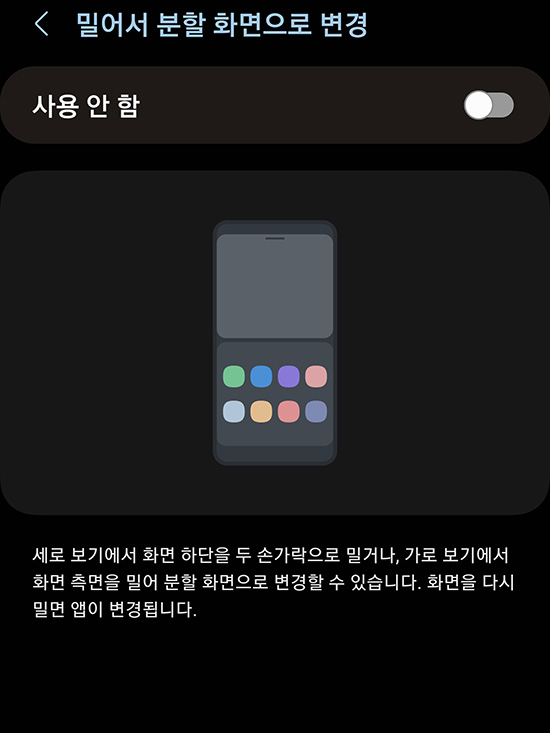 밀어서 분할 화면으로 변경은 앱 사용 중 화면 하단을 두 손가락으로 밀거나 화면 측면을 밀어서 분할 화면으로 변경할 수 있으며 화면을 다시 밀면 사용 중인 앱이 바뀝니다.