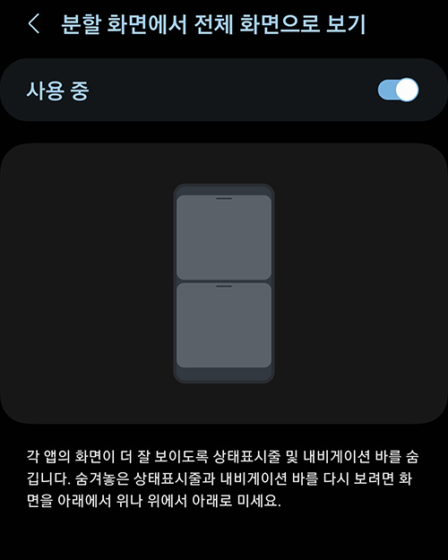 분할 화면에서 전제 화면으로 보기는 분할 화면으로 실행된 앱의 화면이 더 깔끔하게 보이도록 하는 기능으로 화면을 밀면 상태표시줄과 내비게이션 바를 숨겨서 실행 중인 앱이 좀 더 깔끔하게 보입니다.