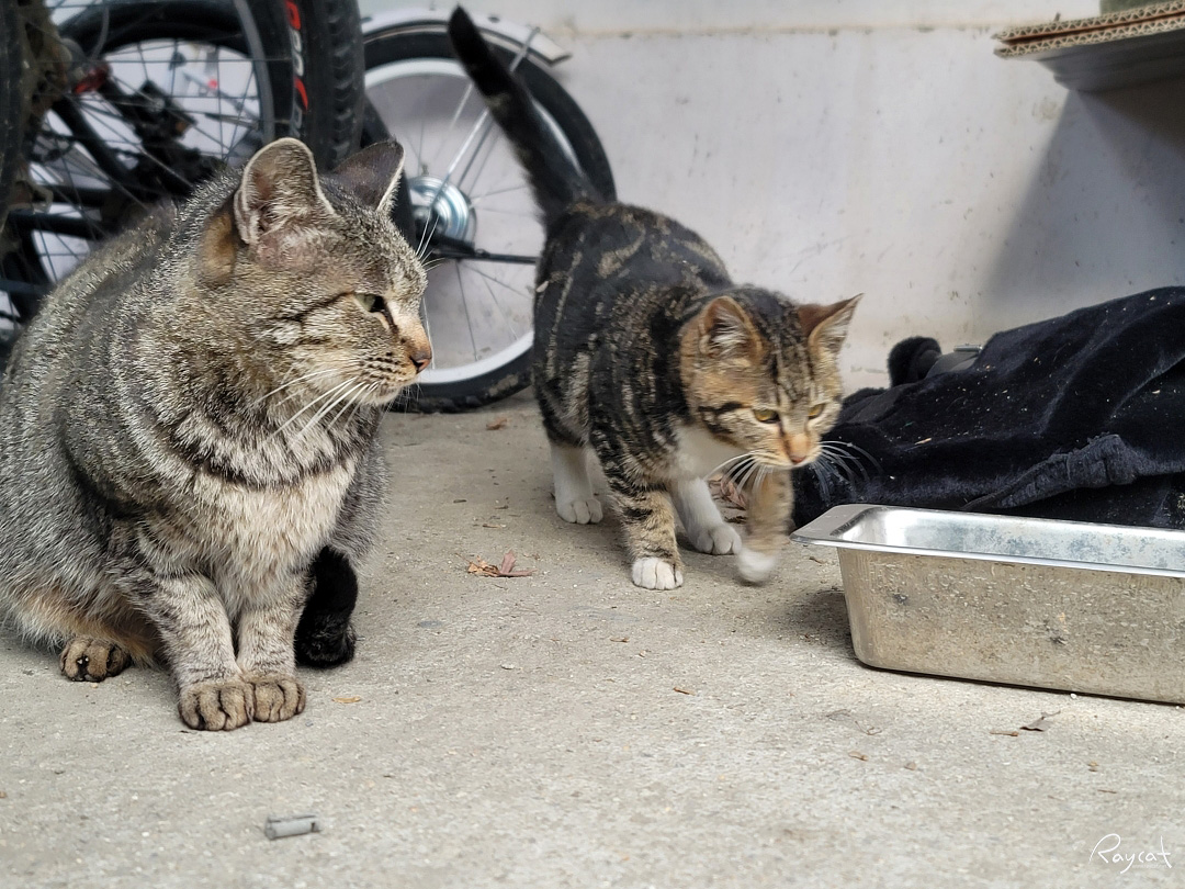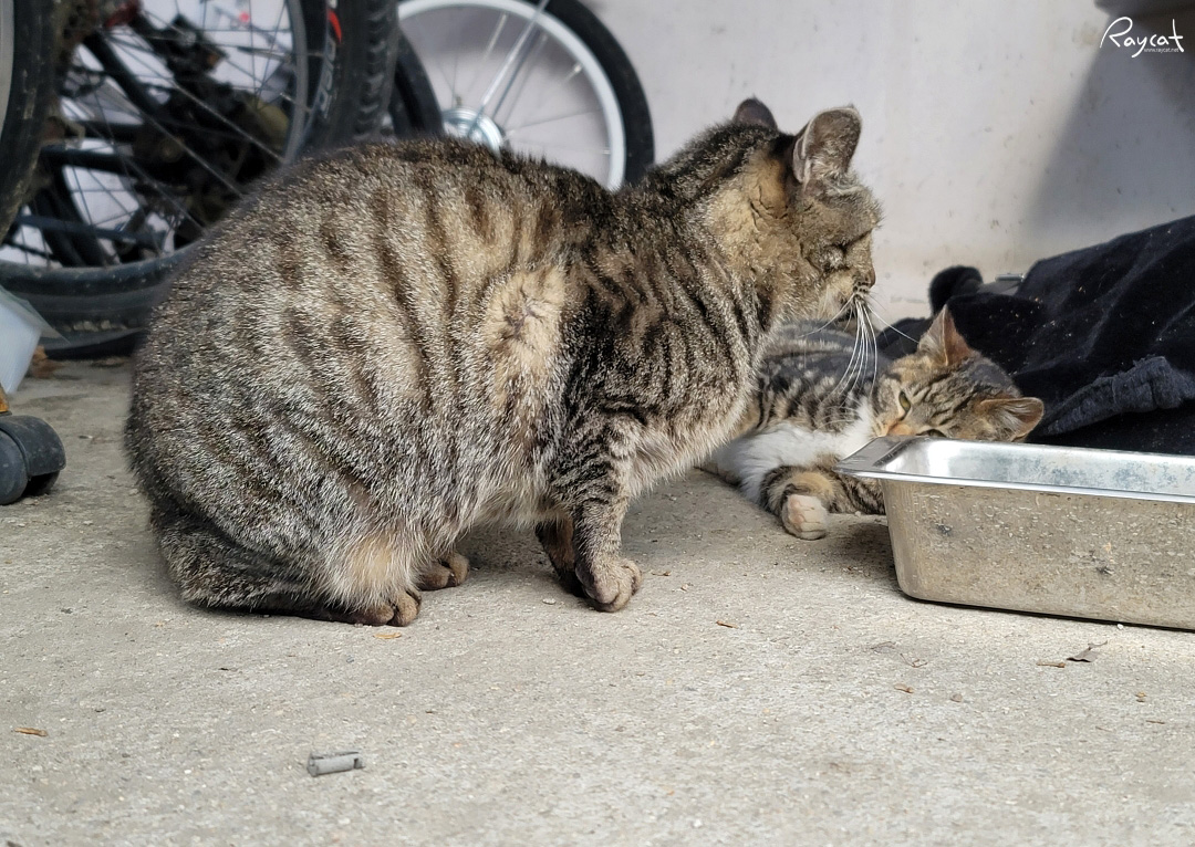 처음에 둘다 눈치보고 숨기 바빴는데 사람이 오면 어미가 지켜보다 나와서 아기 고양이를 뒤쪽으로 밀어 넣으며 보호한다.