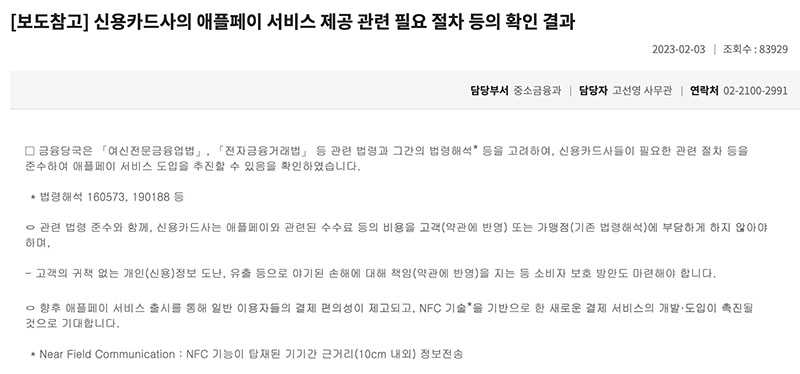 참고로 지난 2월 3일 금융위도 보도자료를 통해 애플페이 서비스 제공과 관련 절차등에 공지를 한 상태입니다.