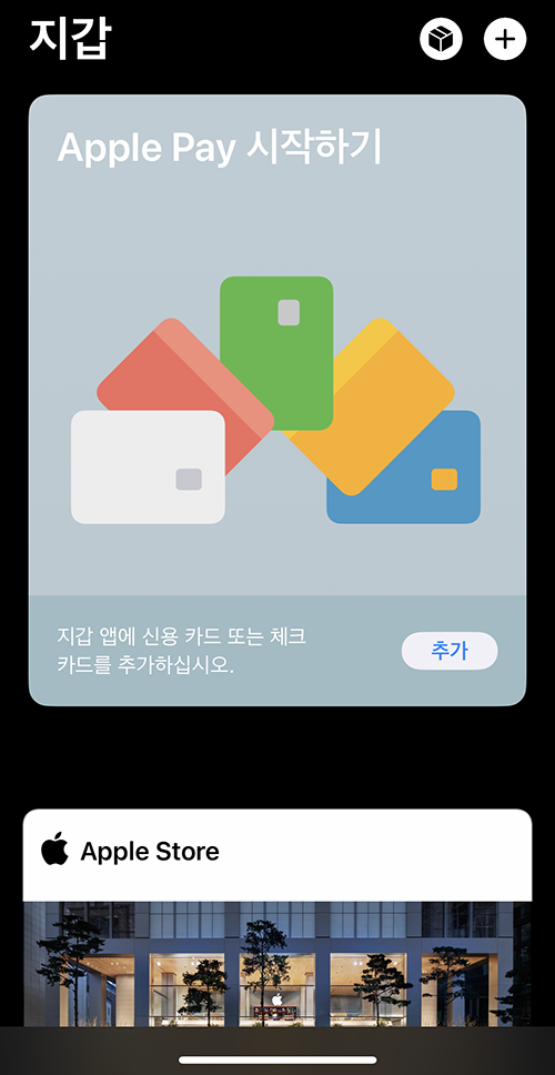 아마 이전에 해외에서 유심을 바꿔 비자나 마스터 카드를 애플페이에 등록해 해외에서 사용해 본 사용자라면 익숙하겠지만 애플페이의 카드 등록은 지갑 앱에서 추가를 누르고 몇 가지 인증을 받고 카드를 등록하면 간단하게 바로 사용할 수 있습니다.