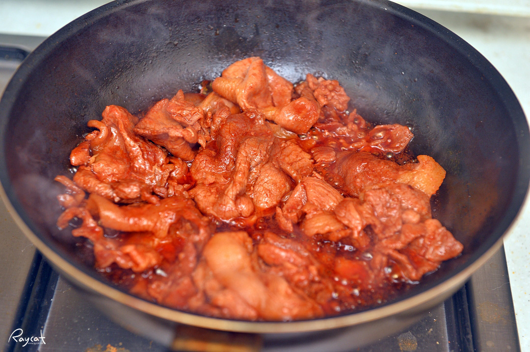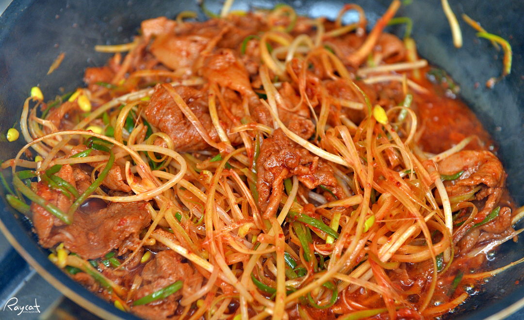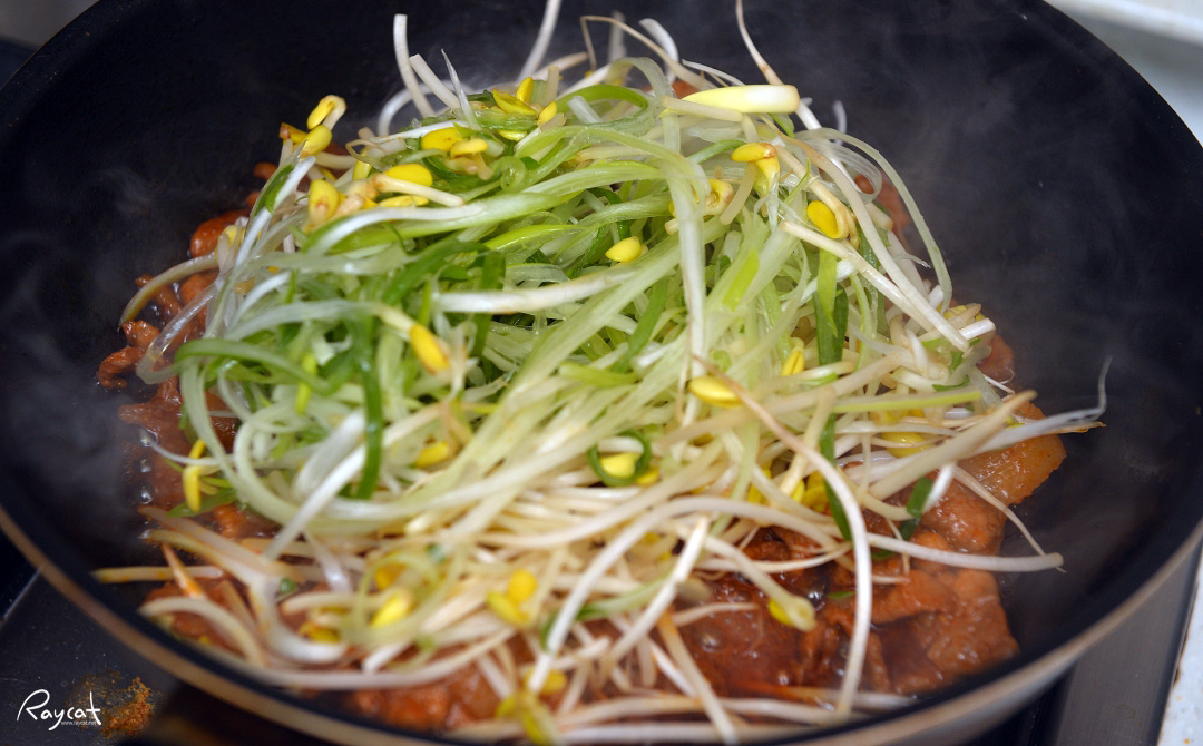 먼저 양념제육을 프라이팬에 먼저 볶고 고기가 익으면 콩나물과 파채를 넣고 함께 볶아줍니다.