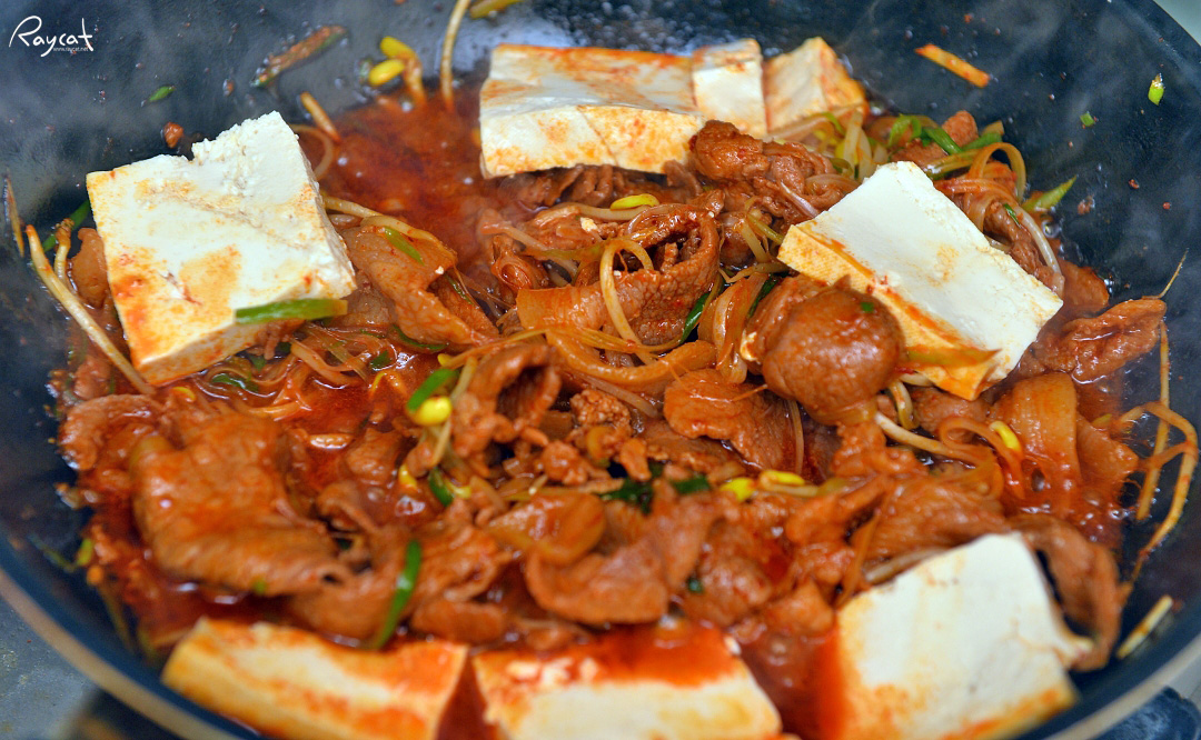 참고로 프라이팬에 기름을 좀 두르긴 했는데 콩나물이나 파채를 볶으면 생각보다 국물이 좀 많이 생깁니다. 어쩌면 중간에 두부를 그냥 넣고 같이 볶아서 그럴지도 모르겠습니다.
