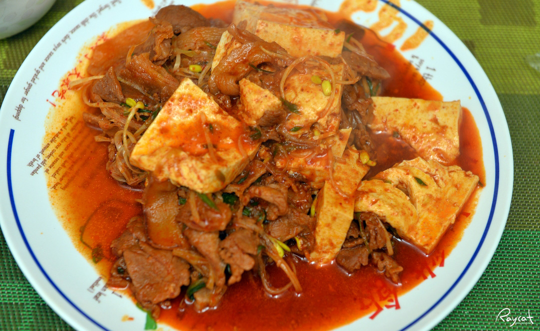 파채외 콩나물, 제육을 함께 볶다가 잘라둔 두부를 넣어서 살짝 같이 볶거나 아니면 제육과 콩나물, 파채를 볶은 후 그 위에 그냥 두부를 올리면 됩니다. 피코크 두루치기 두부제육의 양은 2명이 먹기에 적당하며 혼자 먹기에 많은 양입니다.