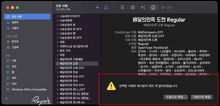 이런 경우 수동으로 직접 찾아서 중복된 폰트를 지우거나 자동으로 해결하는 방법이 있는데 자동으로 해결을 선택하면 중복되어 설치된 폰트를 확인할 수 있습니다.