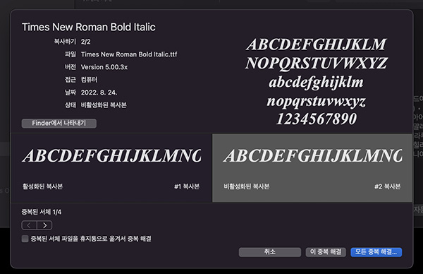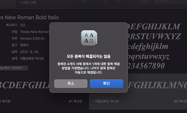 이 경우 서체 관리자에서 폰트를 선택하면 위 이미지와 같이 '선택된 서체의 복사본이 여러 개 설치되었습니다.'란 메시지를 볼 수 있습니다.