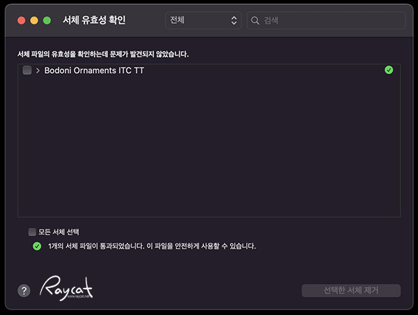 설치한 폰트의 유효성 검사도 서체 관리자에서 폰트를 선택 우클릭 후 유효성 확인을 할 수 있습니다. 유효성 검사에서 문제가 발생하는 경우 폰트가 깨지는 경우가 있기 때문에 사용하지 않는 게 좋습니다.
