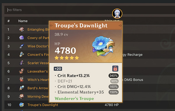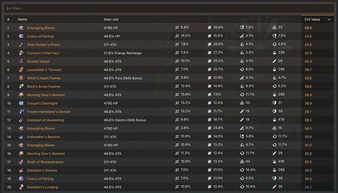 UID를 등록하면 본인이 가진 성유물 순위도 보여주는데 원신에서 치명타 확률이 굉장히 중요하기 때문에 치명타 확률이 높을수록 점수가 높은데 40점 이상이면 꽤 좋은 성유물이며 50점대로 가면 비틱이라 볼 수 있습니다.
