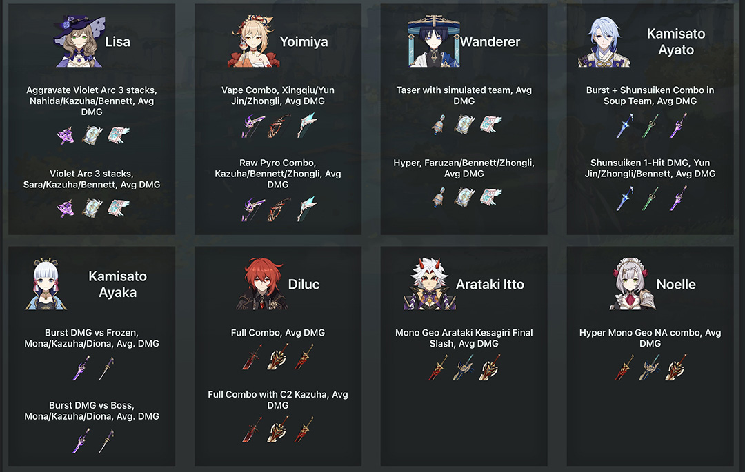 캐릭터별 무기를 선택해 조합과 데미지를 보여주는 것도 있는데 이 시스템의 계산 방식이 치확과 치피를 주로 계산하기 때문에 요즘 원마를 많이 활용하는 풀원소가 들어가는 경우 이곳의 계산과 다르게 나오니 그냥 참고용으로 보는 것이 좋으며 다른 유저의 성유물 조합을 참고할 때 보기 편하게 잘 나열되어 있어서 활용하기 좋습니다.