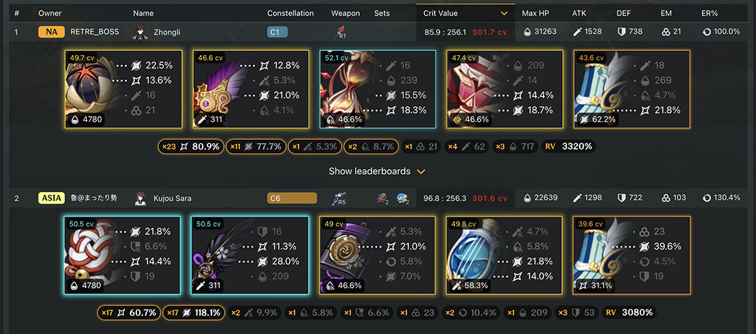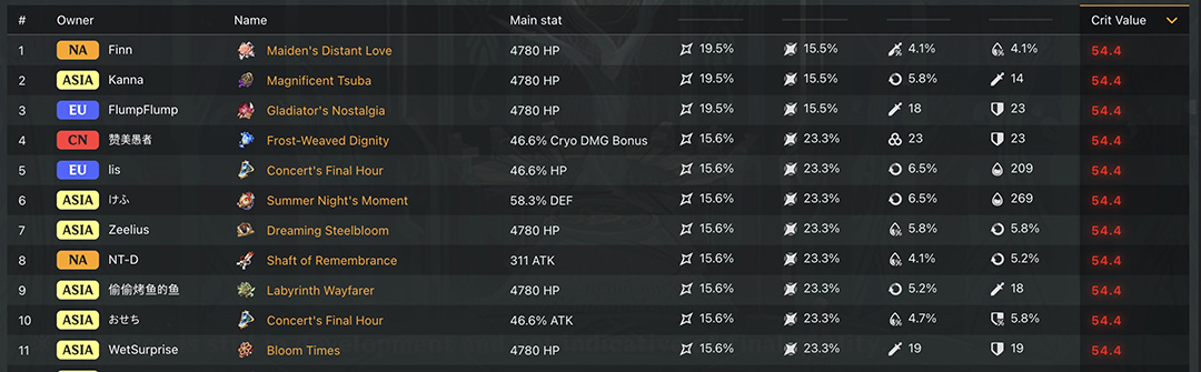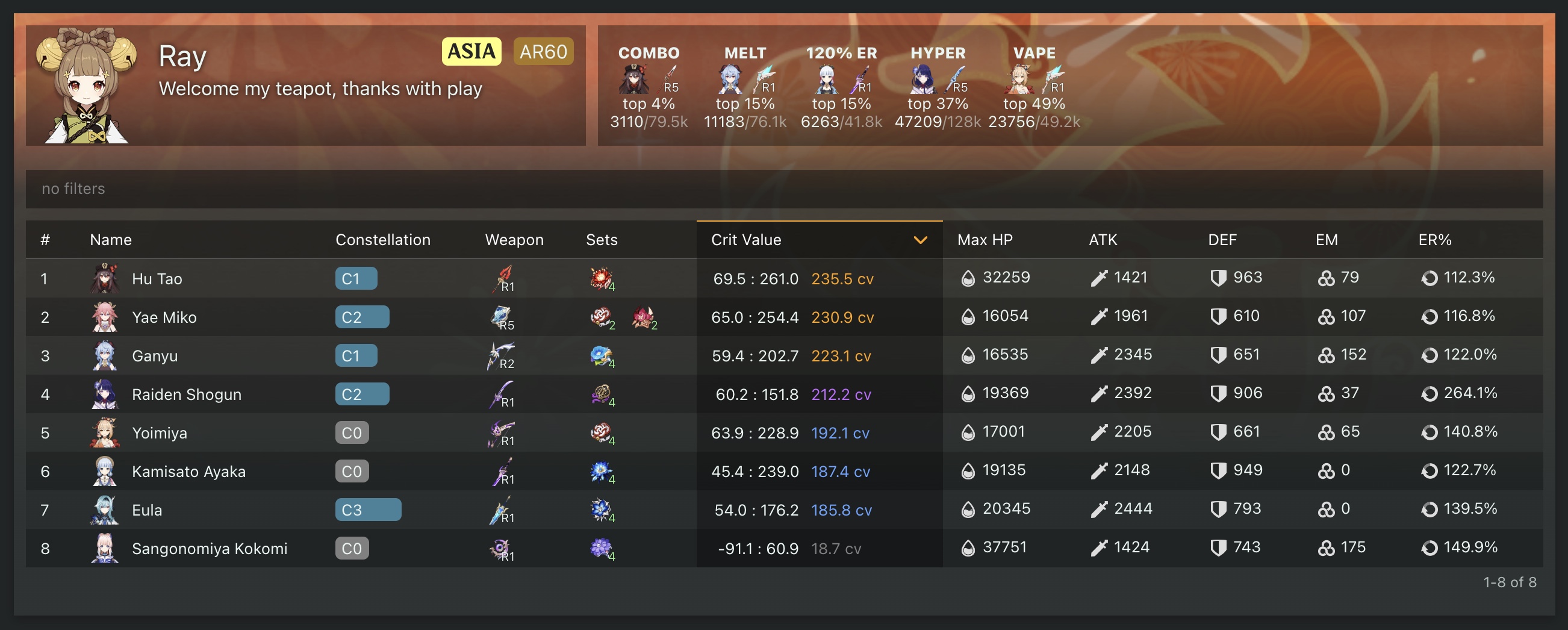 사이트에 원신 UID를 등록하면 자신의 캐릭터 스탯을 나열해 보여주며 점수와 함께 순위가 나옵니다. 여기서 주목해 볼점은 CV로 표기되는 Crit Value로 260cv > 하늘색, 240~259cv > 노란색, 220~239cv > 주황색, 200~219cv > 보라색, 180~200cv > 파란색으로 나옵니다. CV가 180점 이상이면 그래도 성유물의 치확, 치피 밸런스를 잘 맞췄다고 볼 수 있습니다.