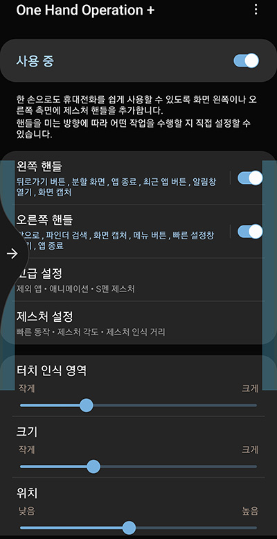 One hand operation(원핸드 오퍼레이션)을 사용하다 보면 한 손으로 조작하기 편하게 도움을 주지만 일부 앱을 사용할 때 오히려 방해가 되는 경우도 있습니다.