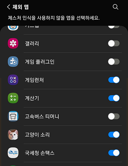 특정 앱을 사용하다 보면 제스처가 동작 안 하거나 혹은 한 손으로 조작하다 보면 기능이 겹치거나 하는 경우가 있으니 제스처 기능이 방해가 되는 앱의 경우 '제외 앱'에서 제외를 하고 사용하는 것이 좋습니다.