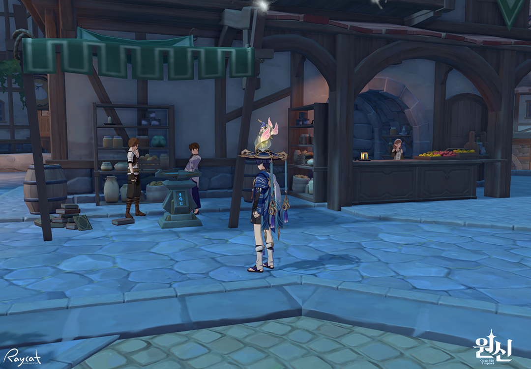 스토리에서 콜레이가 머물렀던 숙소 앞에 가보면 유라, 엠버, 설탕, 콜레이가 이야기를 나누고 있습니다.