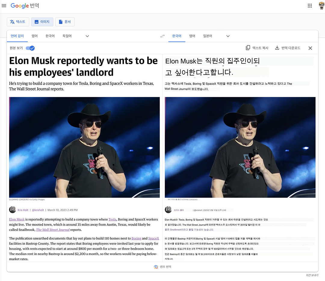 실제로 번역된 이미지를 다운로드해서 원본과 비교해 보면 번역 수준은 아직 좀 모자라지만 이미지를 만들어주니 필요한 경우 요긴하게 사용할 수 있을 것 같습니다.
