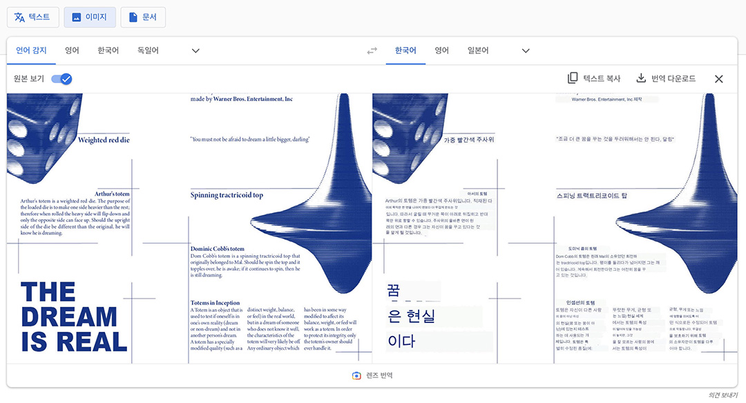 옵션에서 원본 보기를 켜두면 원본 이미지와 함께 그 옆에 번역본이 함께 나오며 번역된 이미지를 다운로드할 수 있습니다. 캡처한 이미지부터 타이포 그라피까지 번역이 됩니다. 아래는 타이포그래피를 번역한 이미지입니다.