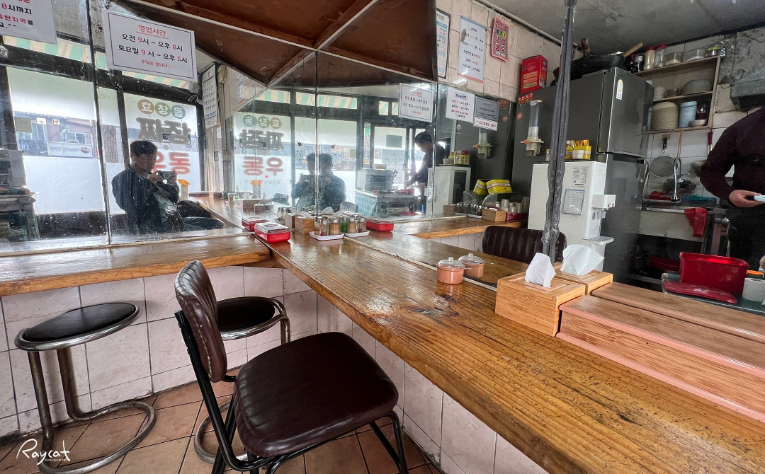 가게는 정말 아담한데 사람이 5명 정도 들어가면 꽉 찬다. 한 3평 될려나 테이블 없이 마치 옛날 포장마차 느낌의 내부인데 긴 탁자에 의자 몇 개만 있고 테이블에는 양념장과 수저통이 간격을 두고 놓여있다.