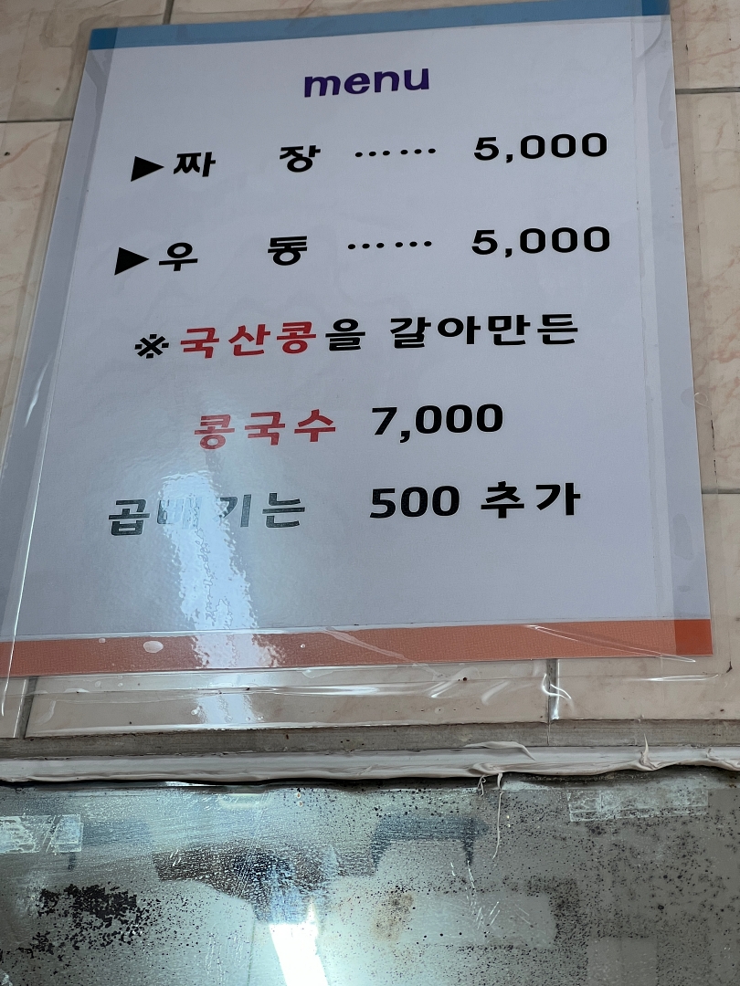 내부는 오래된 느낌이 나는데 실제로 이 동네에서 정말 오래된 가게이기도 하다. 메뉴 선택은 따로 고민하지 않아도 되는데 가격을 보면 가성비 식당이라고 해야 할까? 짜장, 우동 가격이 5,000원이며 곱배기는 500원 추가된다.