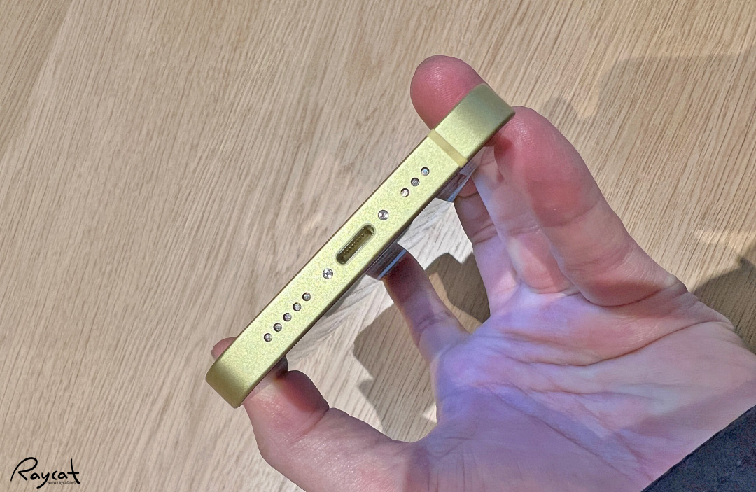 메인 컬러와 마찬가지로 측면도 모두 은은한 노랑색으로 빛을 받으면 금색과 비슷한 느낌을 주며 버튼까지 모두 깔끔하게 잘 마감되어 있습니다. 실물로 보면 측면의 경우 빛을 받으면 반짝반짝한 느낌의 금색에 조금 가깝다는 느낌을 줍니다.