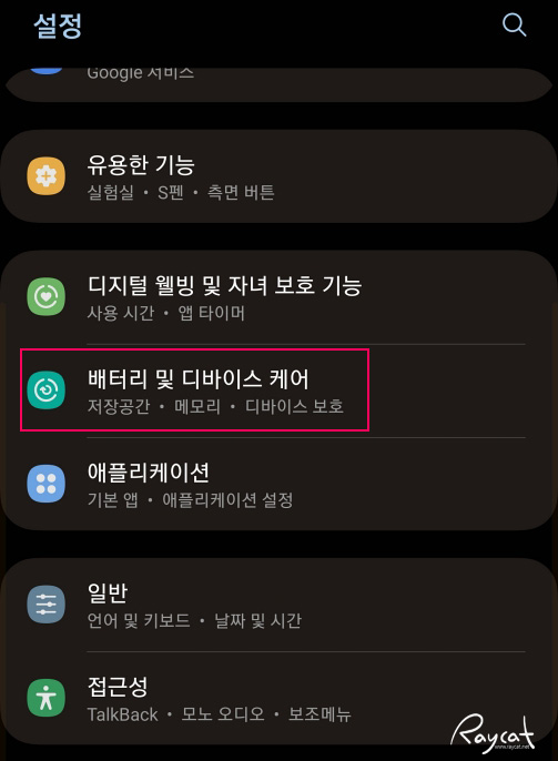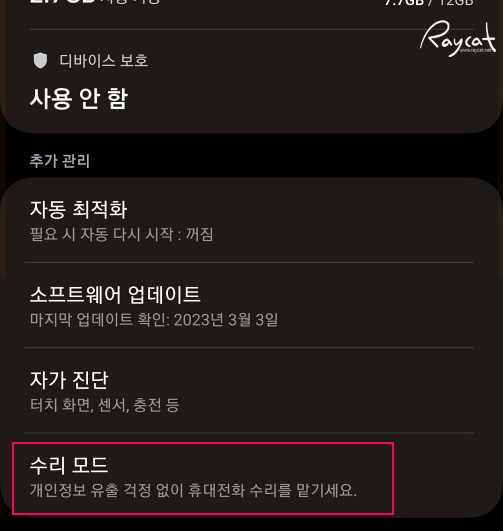 수리 모드 설정은 스마트폰 설정에서 배터리 및 디바이스 케어 탭 후 화면을 아래쪽으로 스크롤해보면 맨 아래에 있습니다.