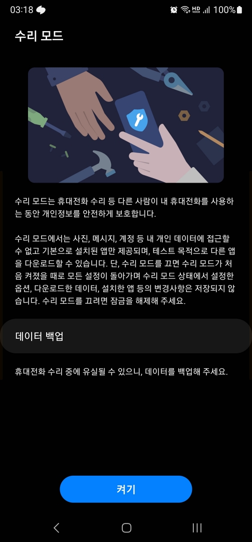 수리모드는 이름 그래도 갤럭시 스마트폰에 문제가 있어 a/s가 필요한 경우 서비스센터에 스마트폰을 맡겨야 할 때 사용하는 모드로 사실 꼭 a/s가 아니라도 다른 사람한테 스마트폰을 맡겨야할 경우 사용할 수도 있을 것 같습니다.