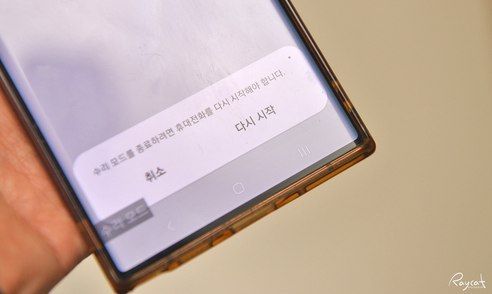 수리 모드 켜기를 하면 스마트폰은 재부팅하게 되고 재부팅 후 스마트폰이 켜지면 아래사진처럼 화면의 아래쪽에 수리 모드가 나오게 됩니다. 참고로 수리 모드에서 화면 캡처가 안되며 일부 기능은 사용 제한이 생기게 됩니다.