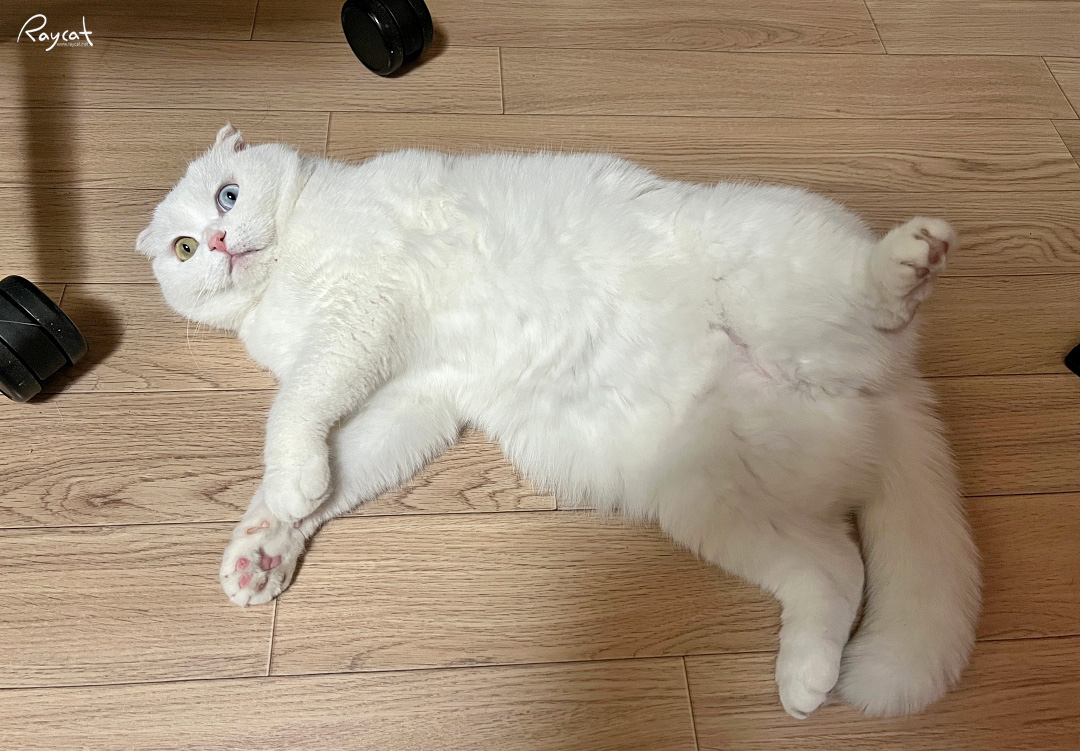 한참 웅크리고 있던 고양이가 요즘 바닥에 큰 대자로 드러눕기 시작한다.